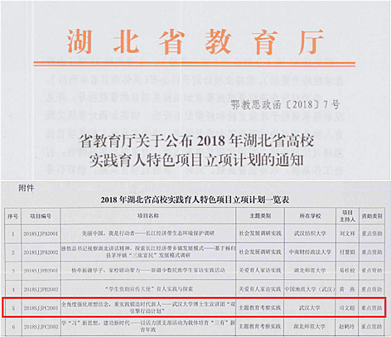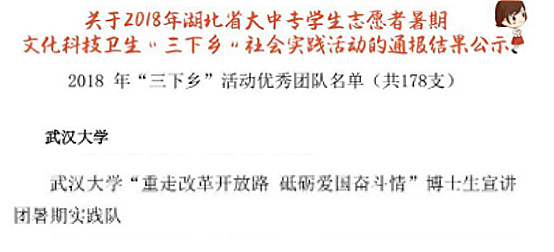 2018年湖北省大中专学生 暑期文化科技卫生“三下乡”社会实践活动优秀团队 |