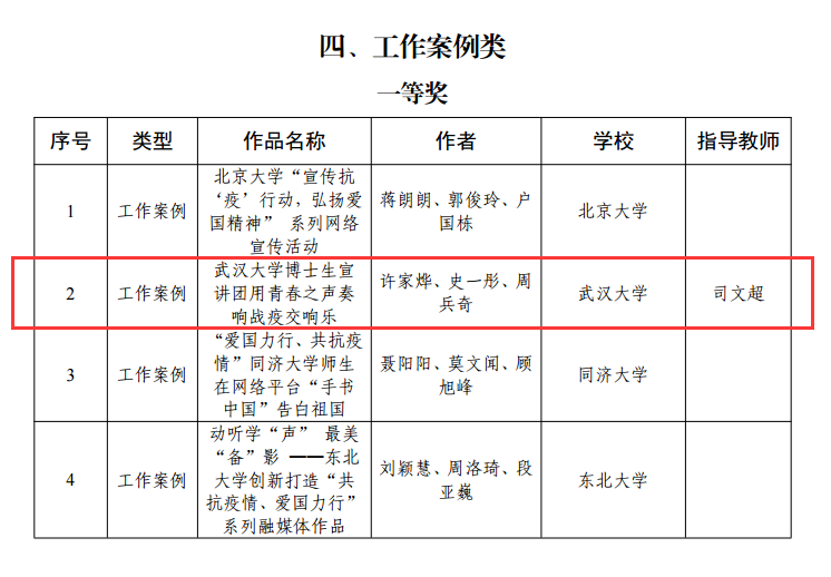 近日,武汉大学学习习近平新时代中国特色社会主义思想博士生宣讲团(以下简称“博士生宣讲团”)在教育部思想政治工作司、中央网信办网络社会工作局主办的“共抗疫情、爱国力行”主题宣传教育和网络文化成果征集展示活动中喜获一等奖(全国仅四项)。